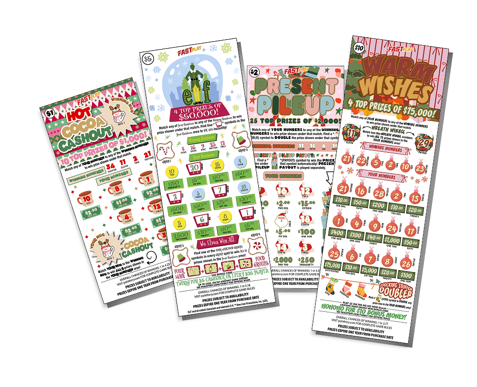 Enter non-winning 2025 Holiday-themed Scratch-Off tickets into the Scratch-Off Drawing for a chance to win up to $150,000. Each ticket will award one (1) entry for every $1 in purchase price.